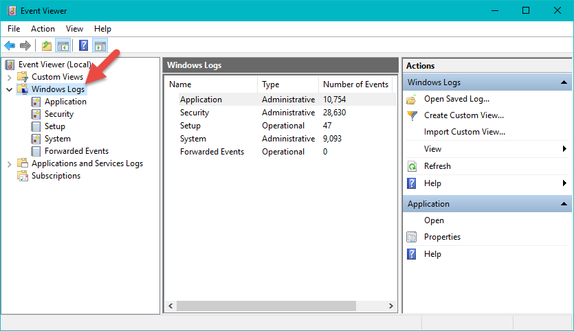 Разверните пункт меню « Журналы Windows» на левой панели, чтобы увидеть журналы приложений, безопасности, настройки, системы и переадресованных событий, о которых мы говорили в предыдущем разделе этого руководства.