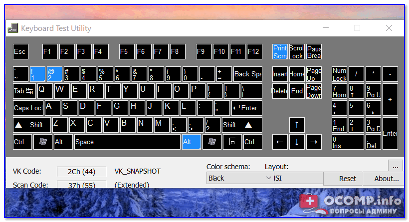 Нас интересуют прежде всего клавиши ALT, SHIFT, CTRL. Для этих целей лучше всего использовать спец. утилиту — Keyboard Test Utility (см. скриншот ниже). В идеале, нужно прощелкать все клавиши и убедиться, что каждая из них зажглась синим цветом (т.е. работает).