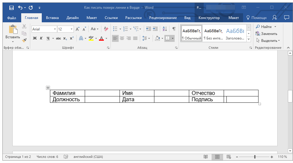 Для начала, удаляем пустую прямую, которая была сделана ранее. Затем на вкладке «Главная» нажмите на кнопку «Ч», чтобы писать подчеркнутым. Поставьте курсор в нужном месте, в примере, после слова «Имя», и нажмите несколько раз пробел, чтобы отделить друг от друга слова. Затем напечатайте то, что требуется, и продолжите подчеркивание, нажимая кнопку пробел.