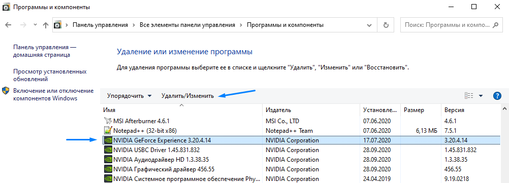 В разделе классической панели управления Программы и компоненты найдите NVIDIA GeForce Experience. Выделив программу нажмите двойную кнопку Удалить/Изменить.