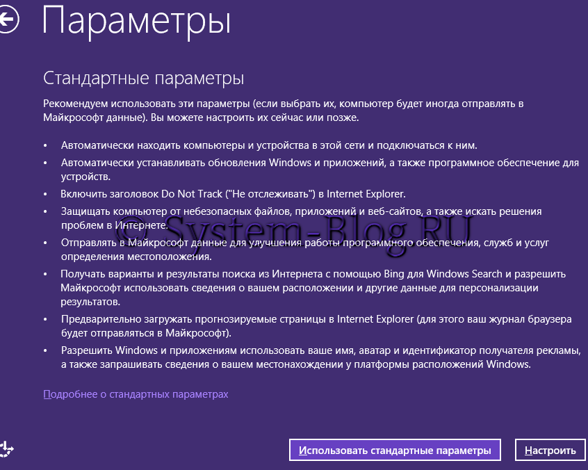 На следующем экране вам предложат установить стандартные параметры Windows 8.1, либо же настроить их по собственному желанию. Это остается на ваше усмотрение. Лично я обычно оставляю стандартные, а уже после того, как ОС установлена, настраиваю ее в соответствии со своими пожеланиями.
