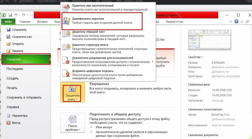 Второй способ подразумевает установку пароля в разделе Excel «Сведения».