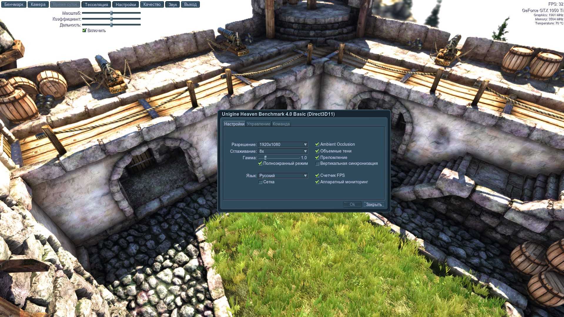 Выставили настройки? Далее можно поставить разрешение (пункт «Resolution») 1024х576 пикселей. Этого хватит, чтобы проверить состояние видеокарты. Особенно рекомендуется выбирать этот пункт тем, у кого старые модели.