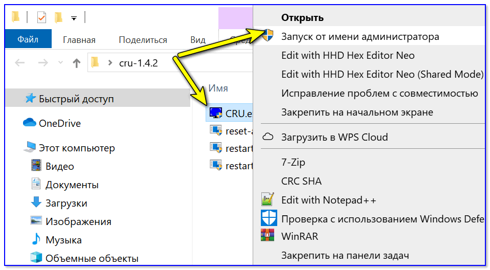 В папке с извлеченной утилитой (CRU) будет несколько файлов. Для начала нужно запустить от имени администратора «CRU.exe» (см. скриншот ниже).