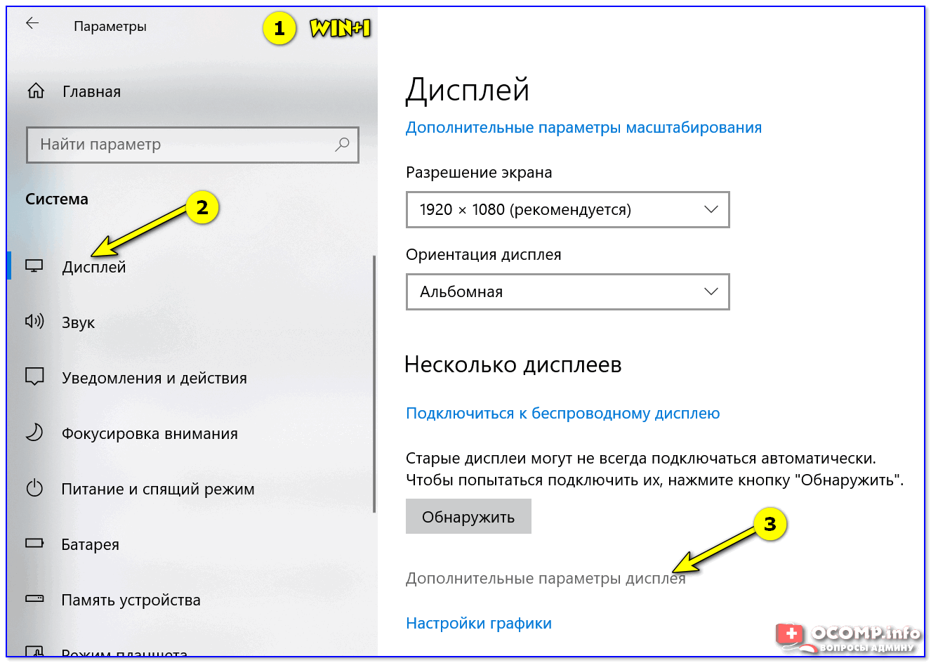 Далее необходимо открыть параметры монитора: в Windows 10 для этого нужно нажать сочетание кнопок Win+i, перейти в раздел «Дисплей» и открыть «Доп. параметры дисплея» (см. скрин ниже).