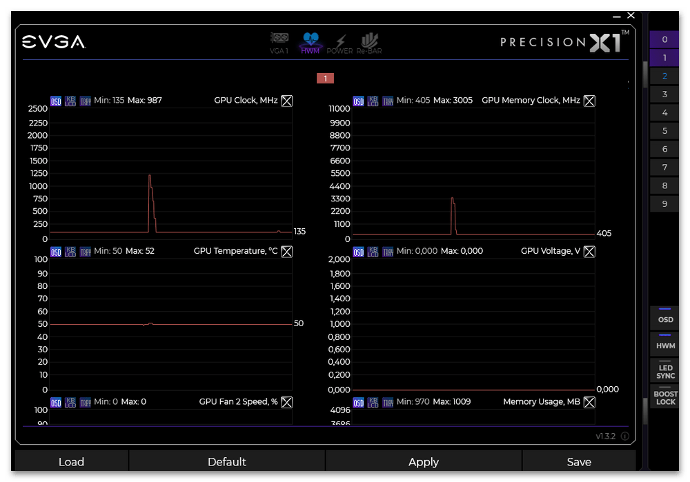 Утилита позволяет контролировать все, начиная от температуры видеокарты, тактовых частот ядра и памяти, напряжения, FPS и процента использования с помощью серии графиков и полноэкранного отображения.