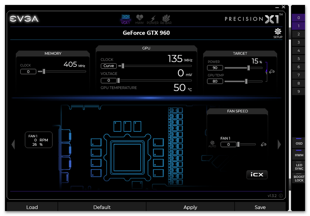 Программное обеспечение может настраивать практически все аспекты видеокарты, включая тактовые частоты, напряжение ядра, ограничение мощности, ограничение температуры, тактовую частоту памяти и скорость вращения вентилятора.