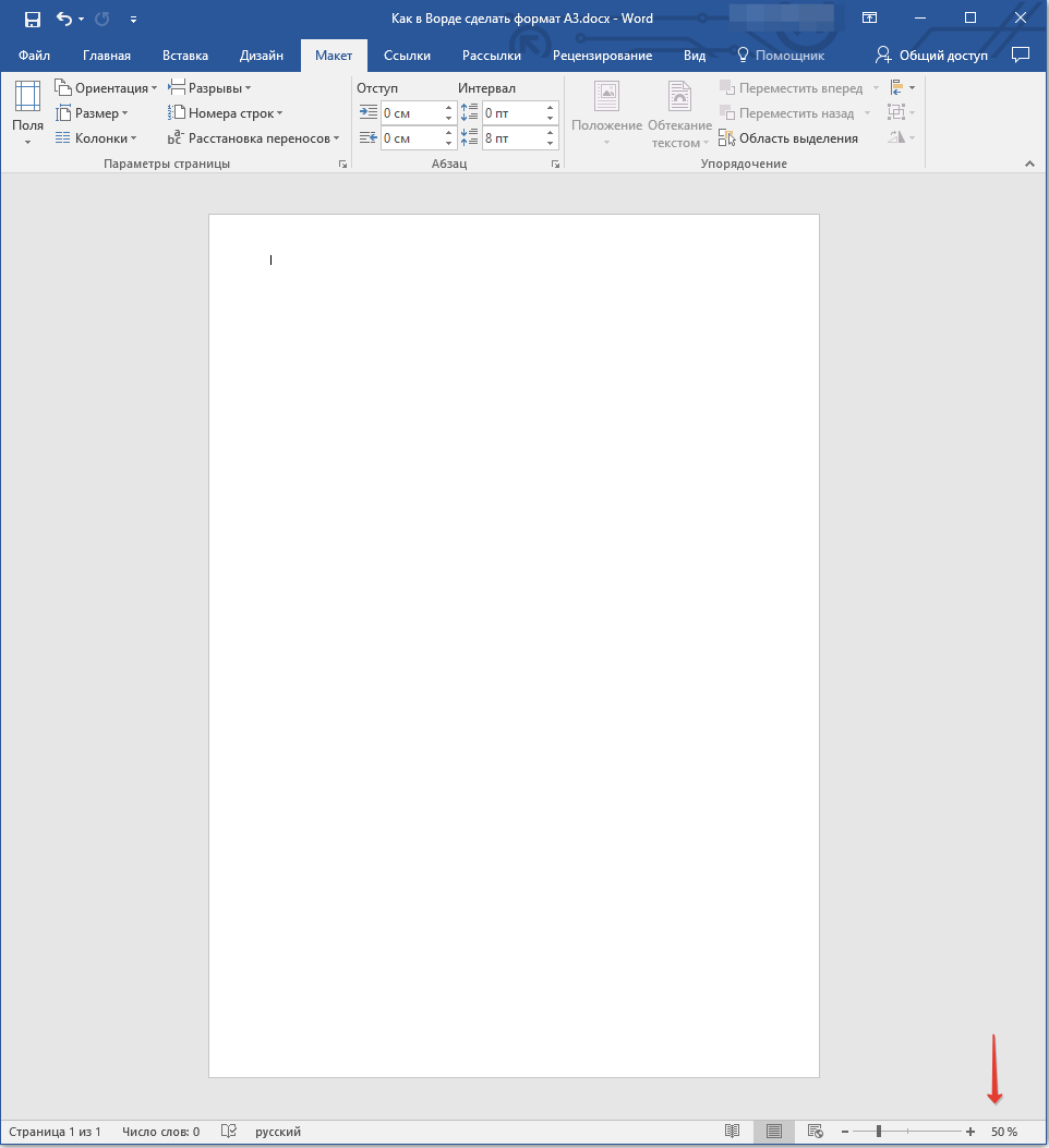 5. Формат страницы изменится на выбранный вами. В нашем случае это A3, а страница на скриншоте показана в масштабе 50% относительно размеров окна самой программы, так как иначе она попросту не влезает.
