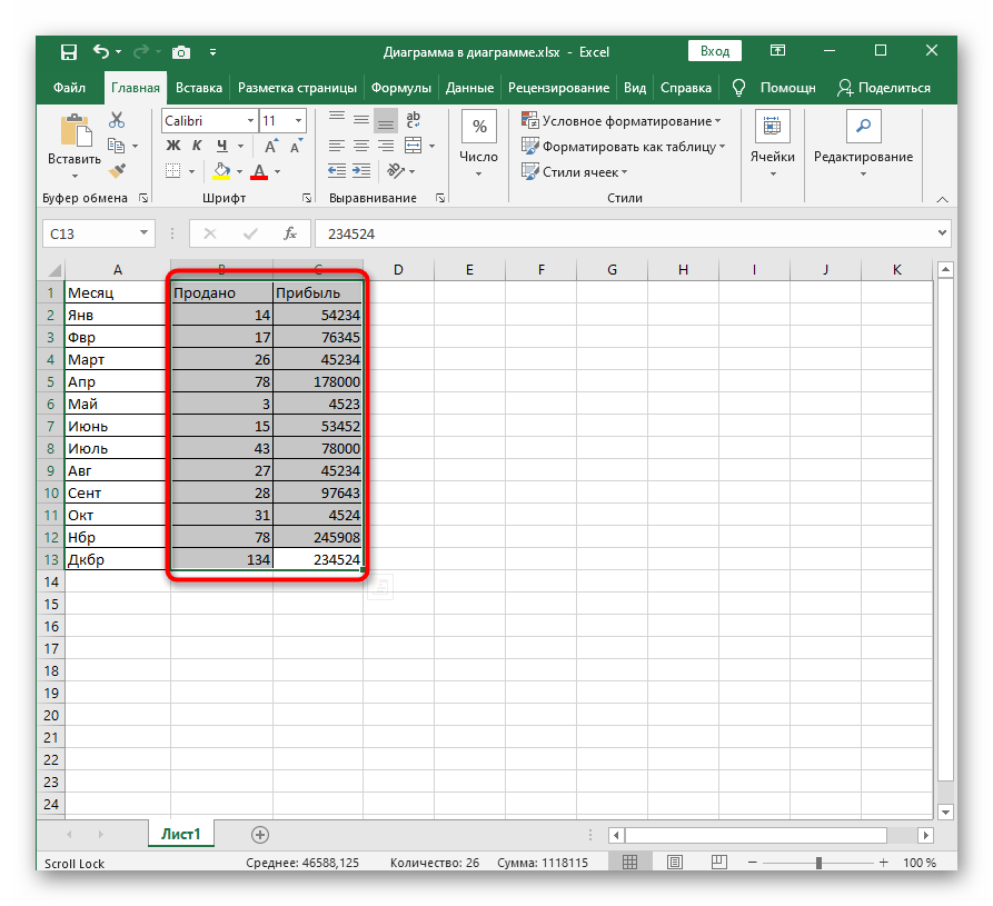 5. На листе появится не только диаграмма, но и Excel, который будут находиться в разделенном окне. В нем же будет выведен пример данных.