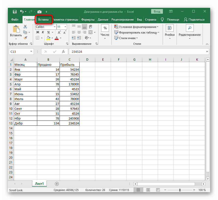 - В главном меню программы выберите пункт «Вставка», в котором активируйте вкладку «Диаграмма».