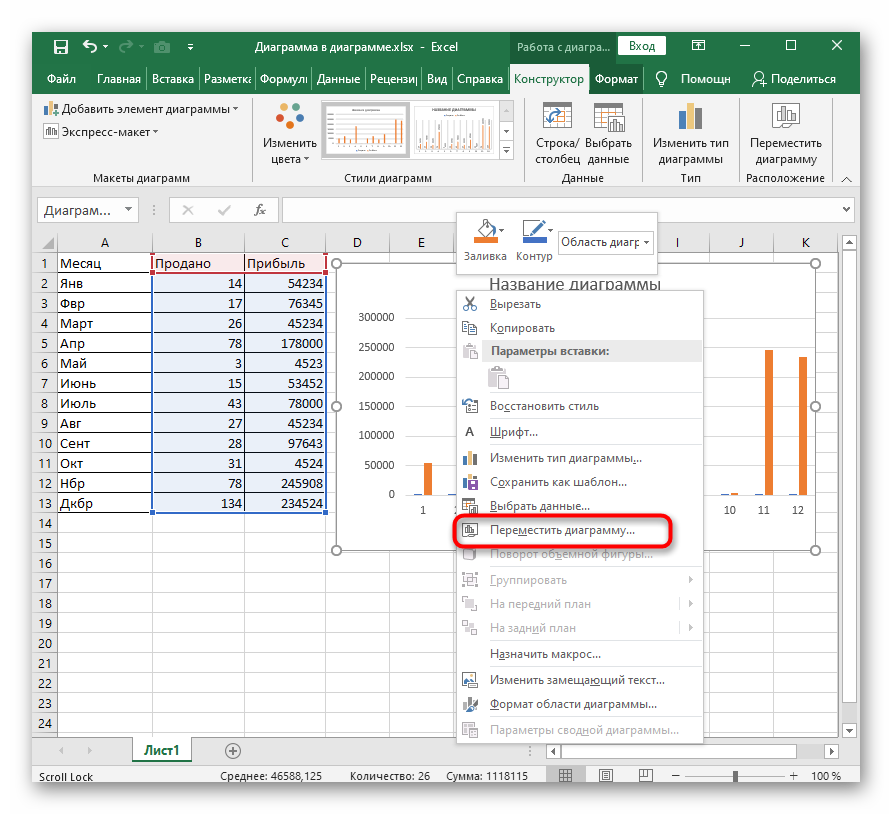 Подробнее: Как в Excel сделать диаграмму Выделите и вырежьте полученный объект. Сделать это можно нажатием клавиш «Ctrl+X» либо же с помощью мышки и меню на панели инструментов: выберите диаграмму и нажмите «Вырезать» (группа «Буфер обмена», вкладка «Главная»).