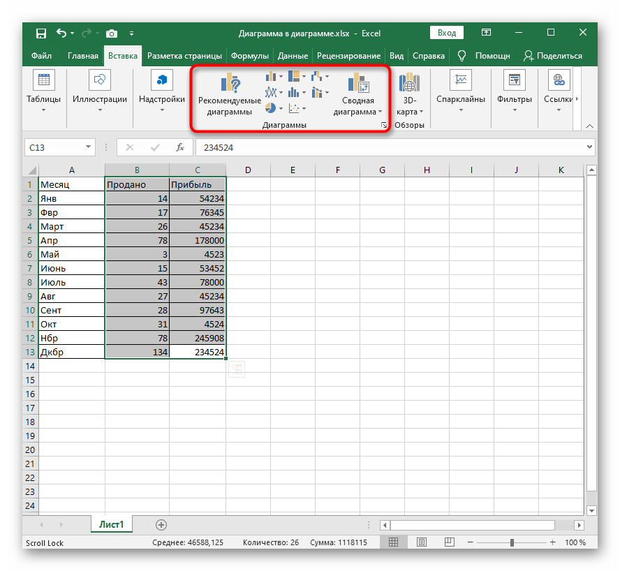Далее перейдите во вкладку «Вставка», где в группе инструментов «Иллюстрации» кликните по пункту «Диаграмма».