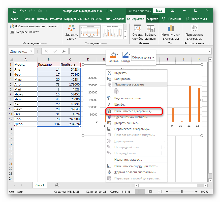 - Чтобы изменить тип диаграммы, щелкните правой кнопкой на появившемся изображении, выберите «Тип диаграммы…»;