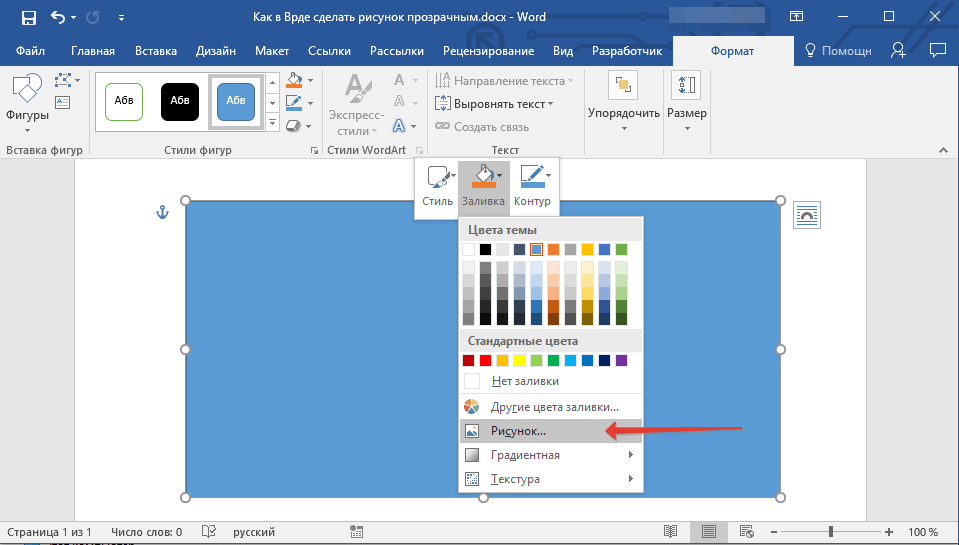 - Поскольку изменить прозрачность картинки вставленной в документ напрямую не получится, то сначала нужно нарисовать на листе фигуру, в нашем случае прямоугольник, залить его изображением и потом уже делать прозрачным.