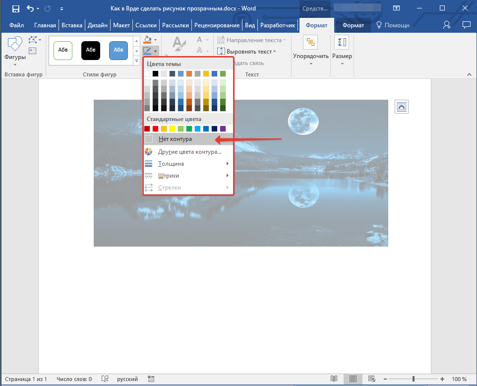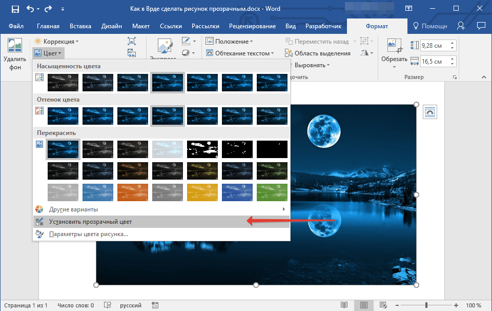 Также в Ворд можно изменить прозрачность не всего рисунка, а только отдельных областей. Выделите объект, перейдите на вкладку «Работа с рисунками» – «Формат», нажмите на кнопку «Цвет» и выберите из открывшегося списка «Установить прозрачный цвет».