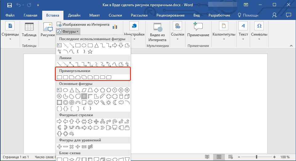 Если у Вас установлен Ворд 2013 или 2016, тогда все действия практически такие же. В фигурах выберите прямоугольник и нарисуйте его поверх того изображения, которое нужно сделать прозрачным.