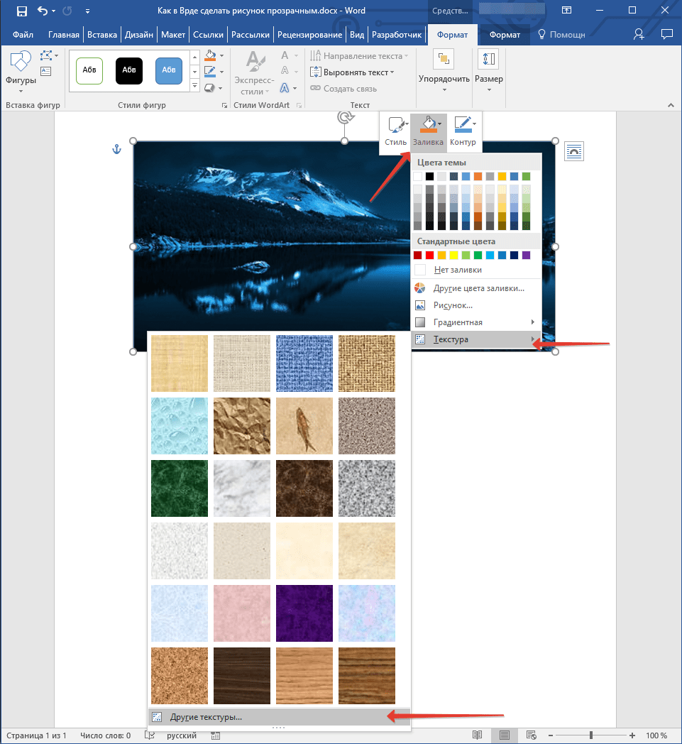 9. Кликните правой кнопкой мышки по добавленному рисунку, нажмите на кнопку “Заливка” и выберите пункт “Текстура”, а затем “Другие текстуры”.