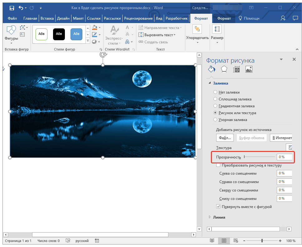 10. В окне “Формат рисунка”, которое появится справа, перемещайте ползунок параметра “Прозрачность”, пока не добьетесь желаемого результата.