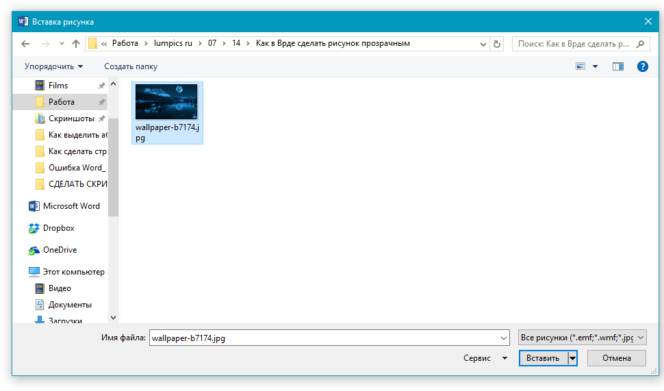 Найдите на компьютере тот файл, которое в документе Ворд нужно сделать прозрачным, выделите его и нажмите «Вставить».