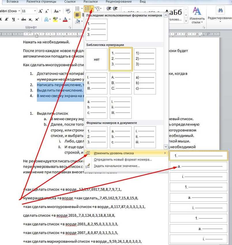 Затем, выбираете из предложенных вариантов тот номер, который Вам нужен. Форматы номеров в документе разные. Внизу списков можно выбрать другие параметры для изменения номеров: