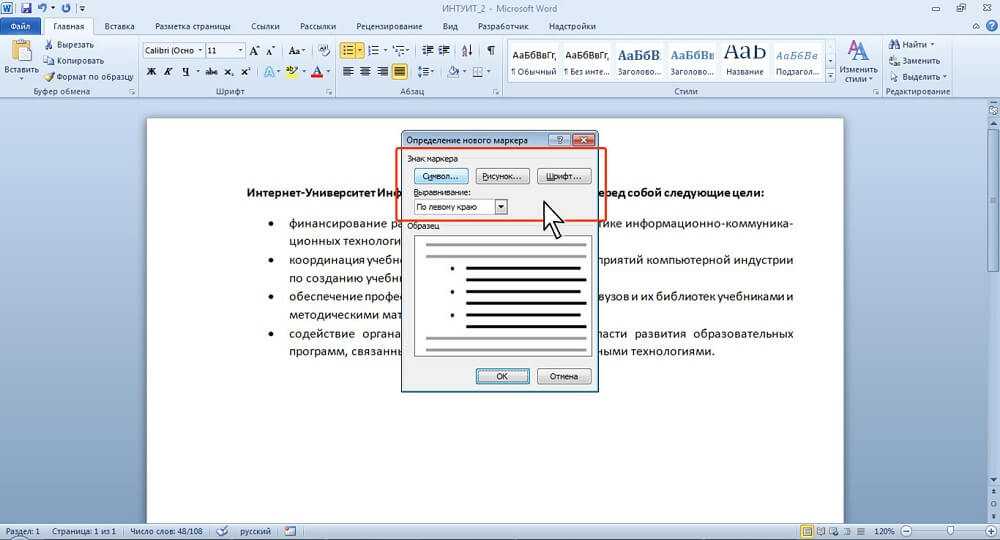 В качестве маркеров выступают различные символы, которые легко подобрать, используя «Библиотеку маркеров». Если предполагается создать в Ворде оригинальный текст с уникальными маркерами, можно перейти на строку «Определить новый маркер», после чего выбрать желаемый рисунок или символ.
