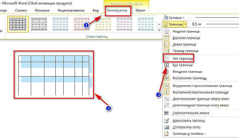 На верхней панели выберите «Конструктор». При помощи специальной панели уберите границы.