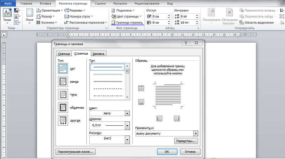 - Переходим на вкладку «Страница», где также выбираем рамку, тип линии и ширину. Указываем, к какой части документа применяем.