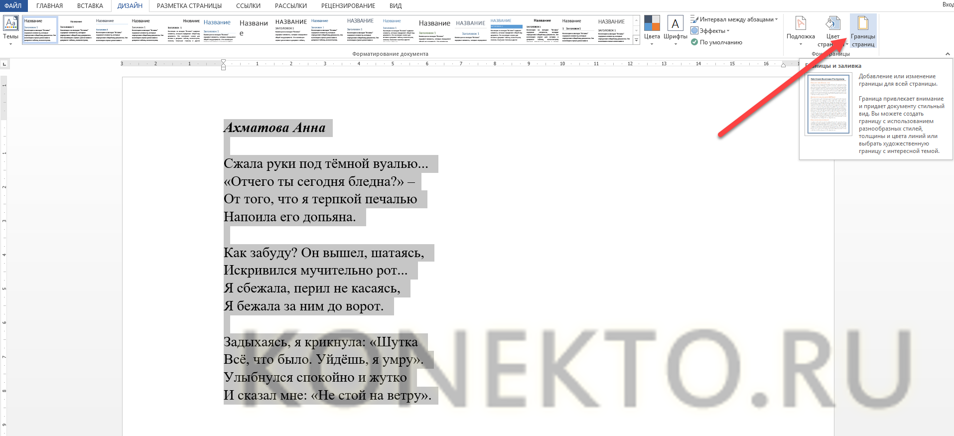 Для начала нам нужно открыть наш текстовый редактор, после чего мы идем во вкладку Дизайн. В ленте, в самое правой части, нажмите на пункт «Границы страниц». А дальше выбираем ту вкладку, которая нас интересует.