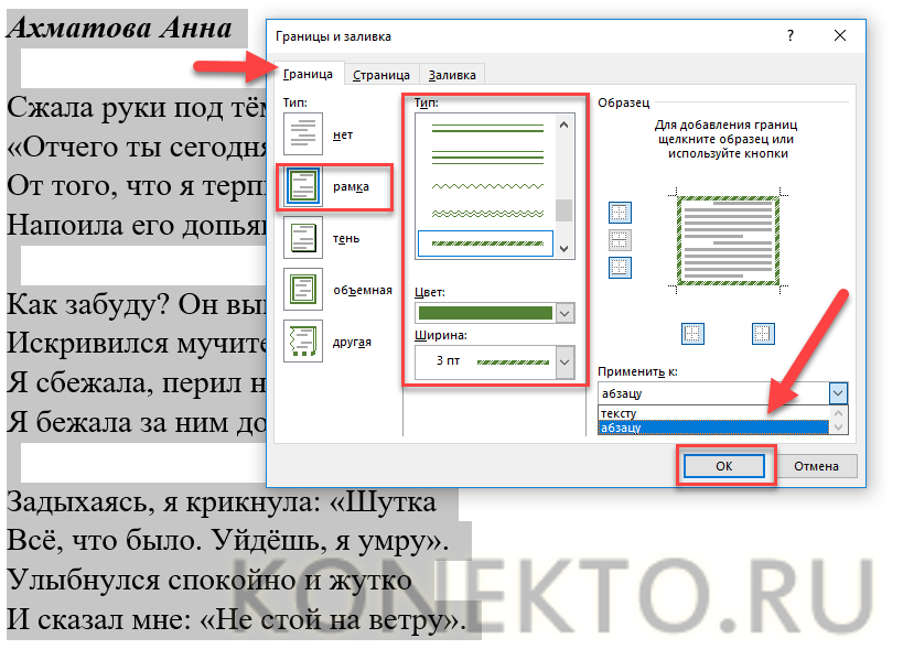 В нижнем правом углу находим предложение «Применить к…». Здесь так и хочется выбрать «текст», однако в таком случае каждая строка вашего текста будет заключена в рамку. Если этого не требуется, то останавливаемся на «абзаце». Нажимаем «Ок».
