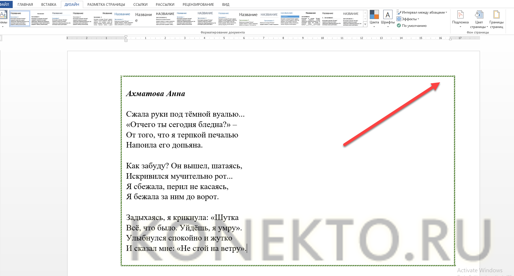 Выделяем текст, который планируется заключить в рамочку. Во вкладке «Дизайн» кликаем по иконке «Границы страницы».