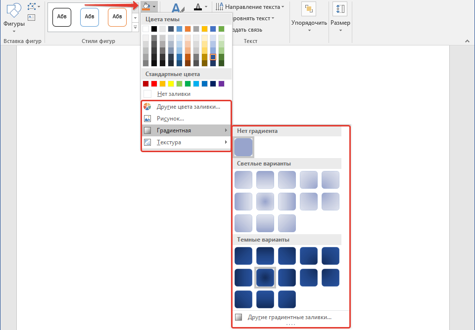 Для этого выберите подходящие цвета в выпадающем меню кнопок «Заливка фигуры» и «Контур фигуры», которые расположены справа от окна с шаблонными стилями фигур.