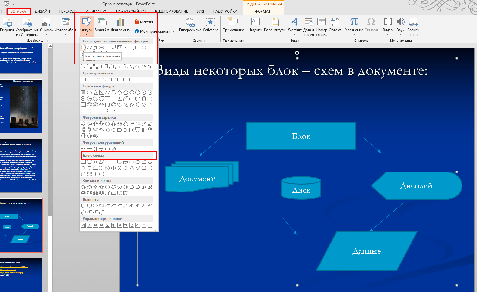 В выносках выбираем нужную и используем. Так же в программе можно использовать блок- схемы для подачи подходящего материала: