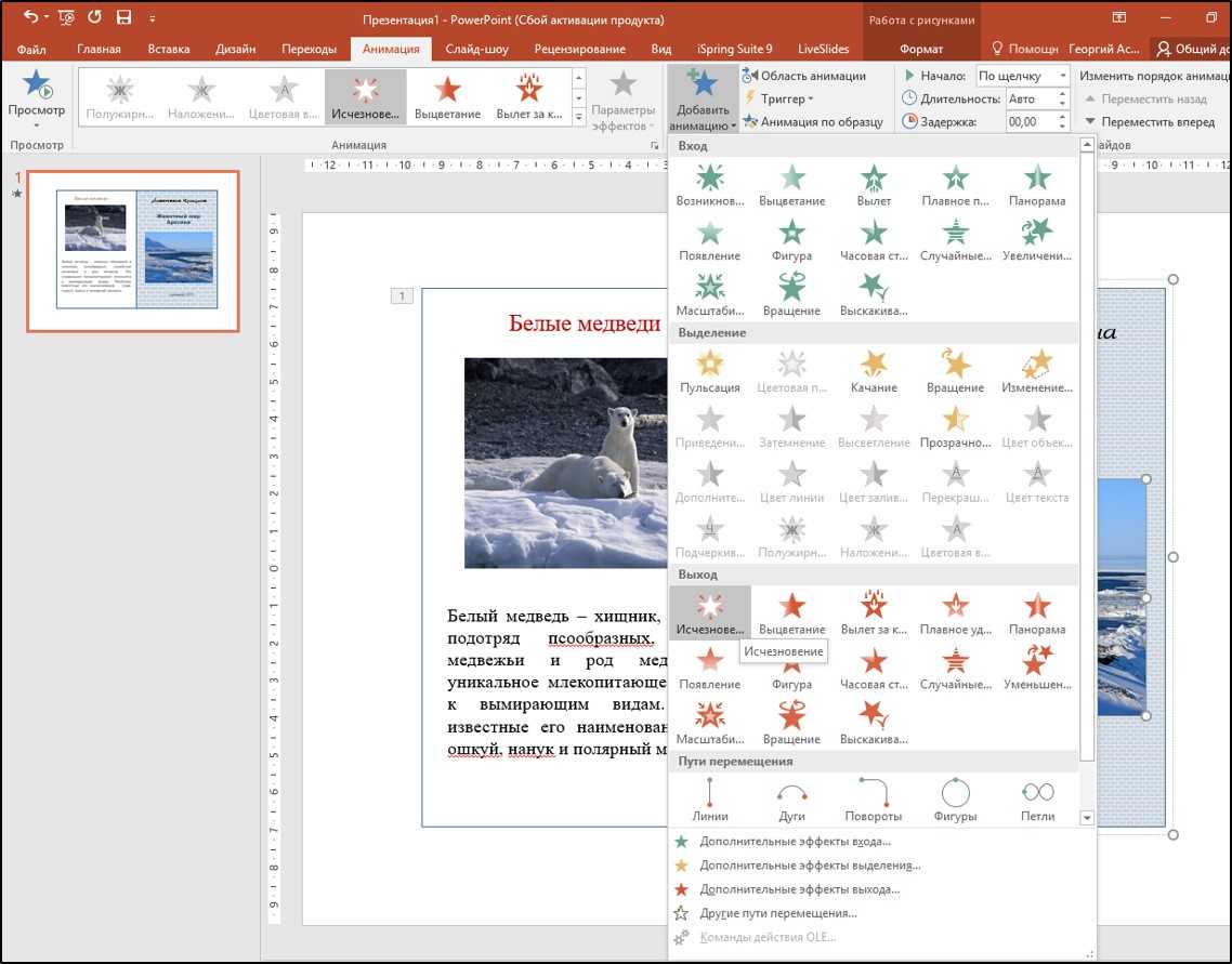 5. Подчиняем весь сгруппированный объект эффекту анимации Исчезновение. Шаги: Анимация — Добавить анимацию — Выход — Исчезновение.