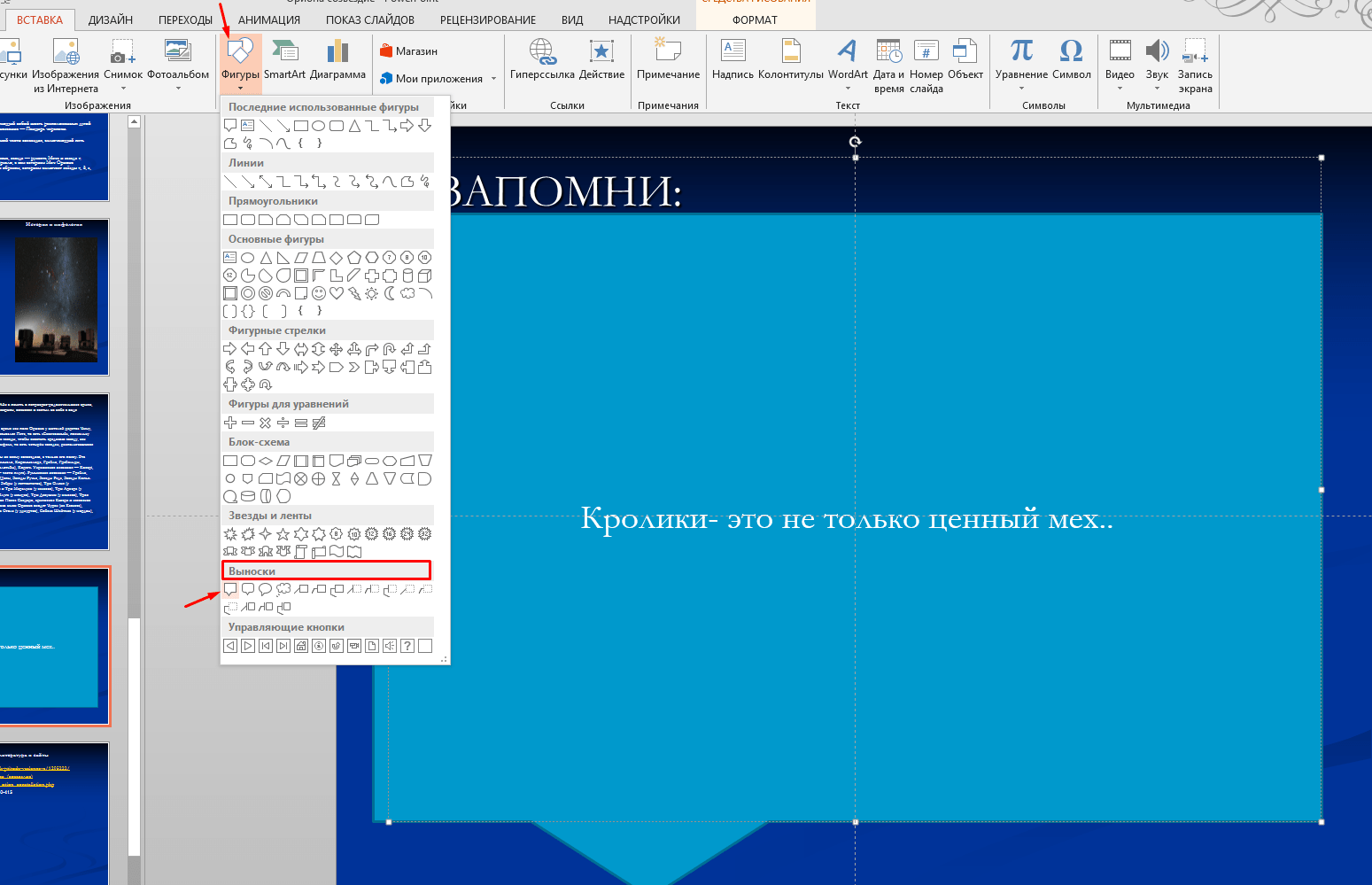 Продолжая тему фигур, напоследок расскажу, что для наглядности можно поместить на слайд какую нибудь нужную нам фигуру, например цитату. Нужно открыть меню «Вставка», затем «Фигуры»: