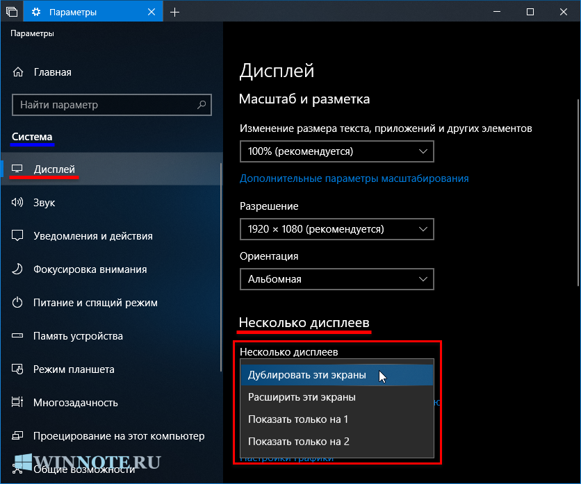 Затем в правой части окна нажмите на раскрывающийся список Несколько дисплеев и выберите один из пунктов.