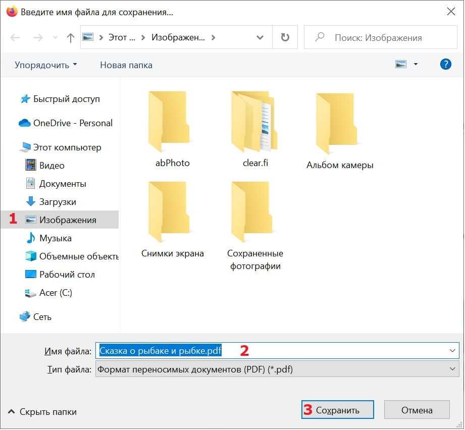 Также можно поменять имя файла (2 на рис. 3). Например, вместо «Сказка о рыбаке и рыбке.pdf», можно ввести без кавычек «пушкин». Тогда получится другое имя, а именно: пушкин.pdf. Либо можно имя файла не менять, а оставить прежнее имя.