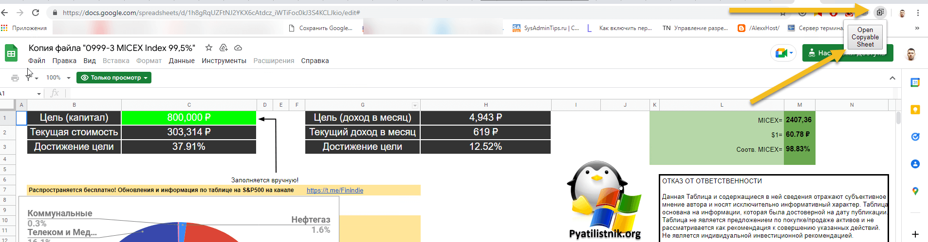 Далее откройте вашу защищенную от изменений и копирования Google таблицу и нажмите на значок Enable Spreadsheet Copy, в результате он так же откроет превью версию данного документа, где вы сможете произвести копирование.