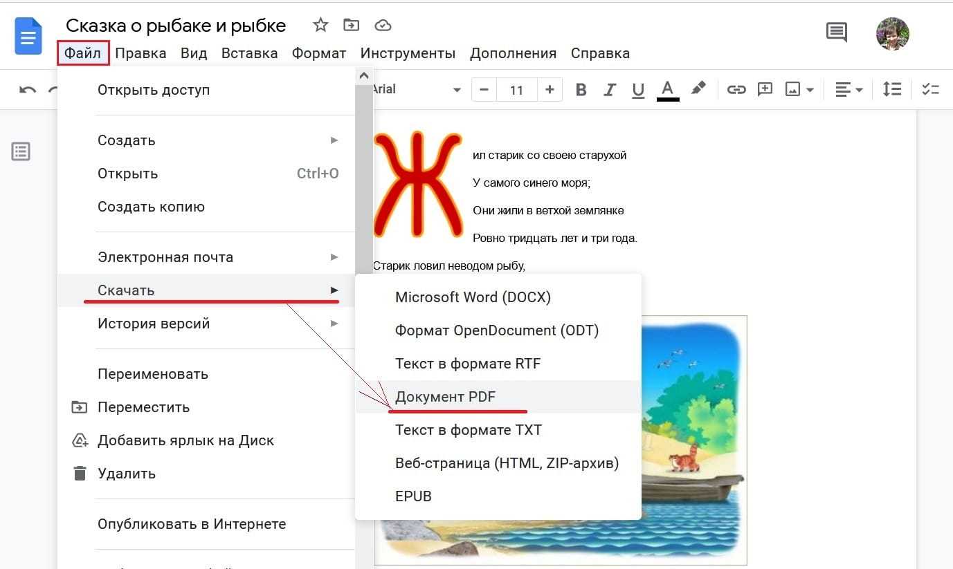 На рисунке 1 открыт документ «Сказка о рыбаке и рыбке». Чтобы этот документ из Google Docs скачать на свой компьютер, следует в верхнем меню кликнуть «Файл». Откроется меню, в котором есть команда «Скачать».