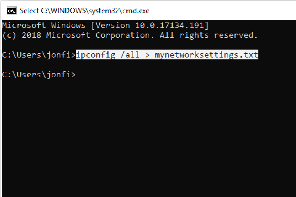 В этом примере вся информация о конфигурации сети обычно отображается на экране после запуска IPCONFIG / все, сохраняется в файл с именем mynetworksettings.txt. Он хранится в папке слева от команды, в данном случае C: Users jonfi.