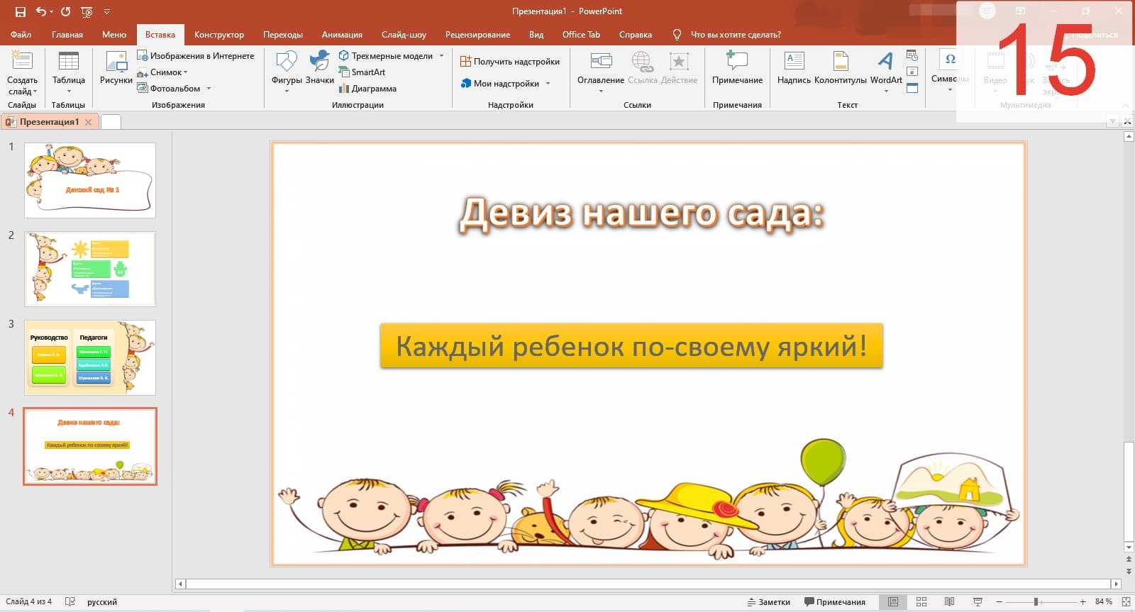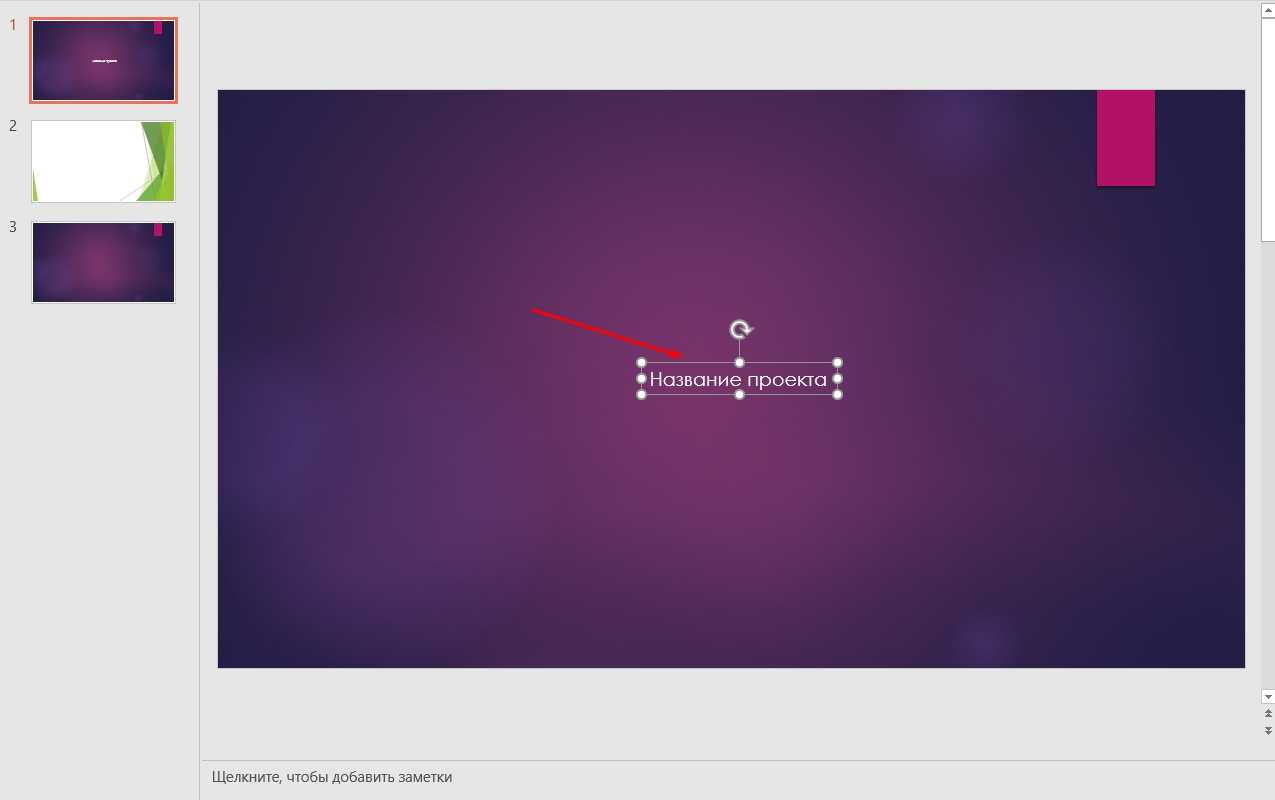 Следующий момент – это добавление текстового содержимого. В случае с примером будет рассмотрен вариант, где для первого слайда создаётся название всего проекта: