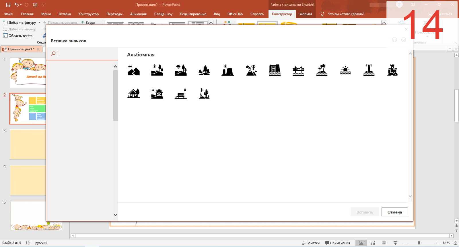 Чтобы вставить значки в ваш тип объекта, сделайте двойной клик мышью по месту вставки. Появится окно с вариантами выбора. Помимо этого, автоматически откроется вкладка «Конструктор», в которой можно сменить макет, цвет и стиль объекта (рис. 13).