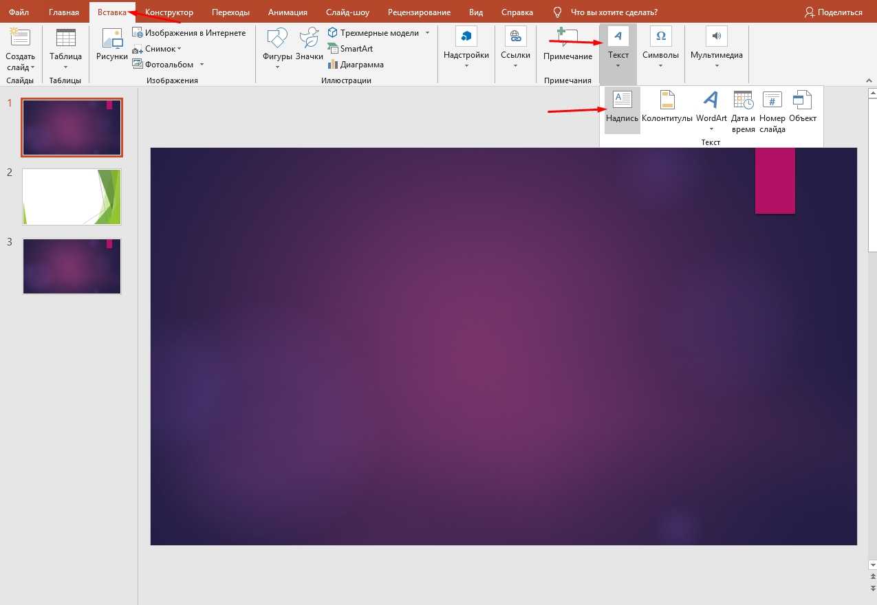 - Перейдите во вкладку «Вставка», предварительно открыв тот слайд, куда необходимо добавить объект.