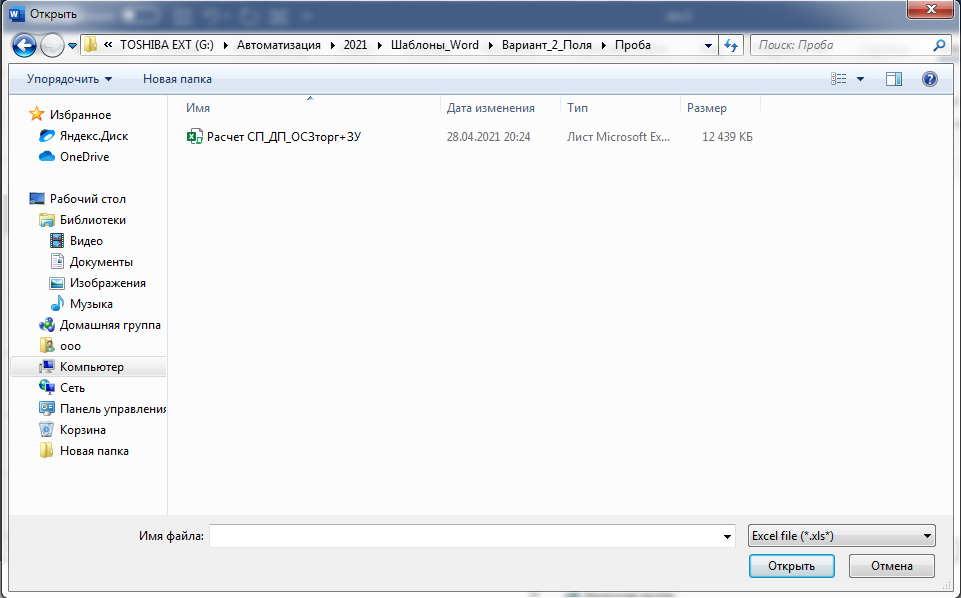 - В отобразившейся форме «Открыть» найти и выбрать Excel файл, из которого будет копироваться содержимое ячейки и вставлено в указанное место документа Word. Далее нажать на форме кнопку «Открыть».