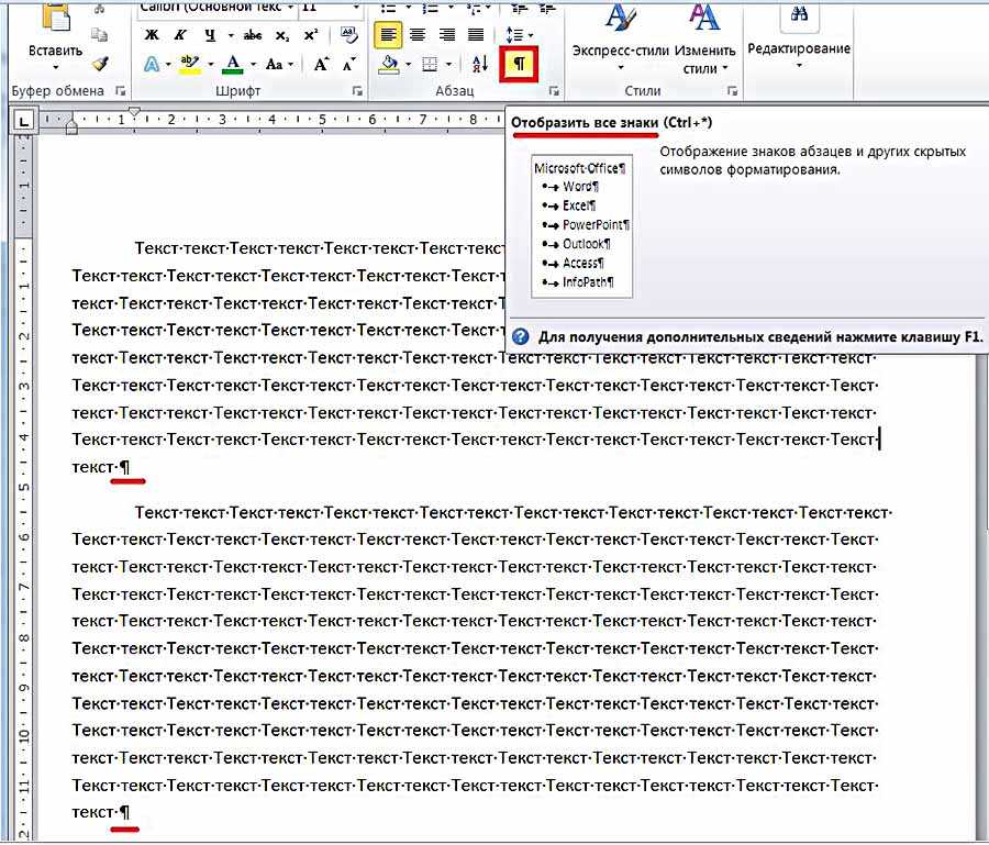 Для начала нужно визуализировать непечатаемые символы. Делается это путем нажатия соответствующей кнопки на панели инструментов. Ее расположение вы запросто можете наблюдать на картинке ниже.