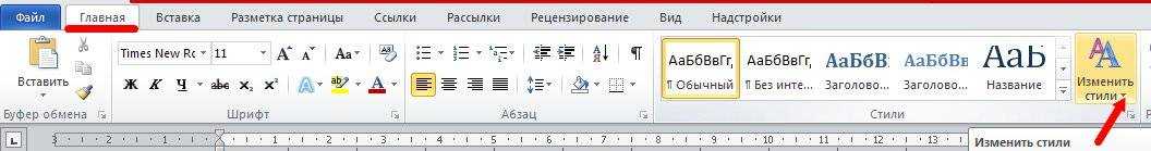 Переходим на вкладку Главная и в группе Стили выбираем команду Изменить стили;