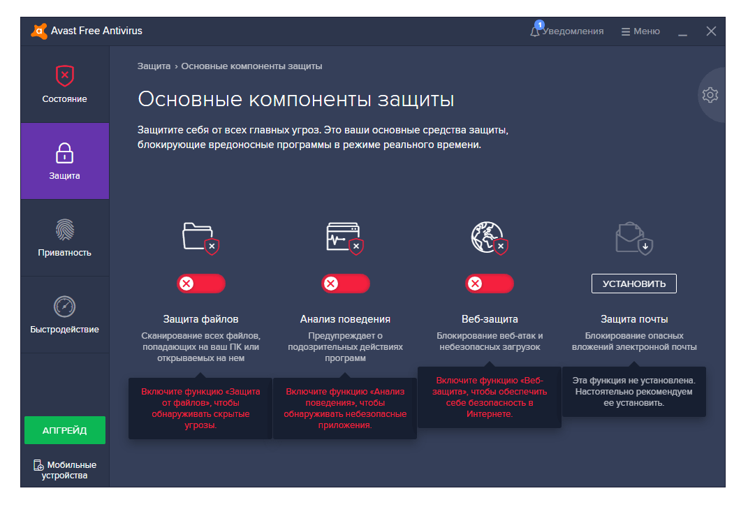Полное отключение антивирусника Avast обычно является излишним. Если вы просто хотите открыть заблокированный сайт или вложение электронной почты, вам лучше отключить конкретные компоненты Avast, а не всю программу: