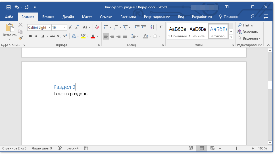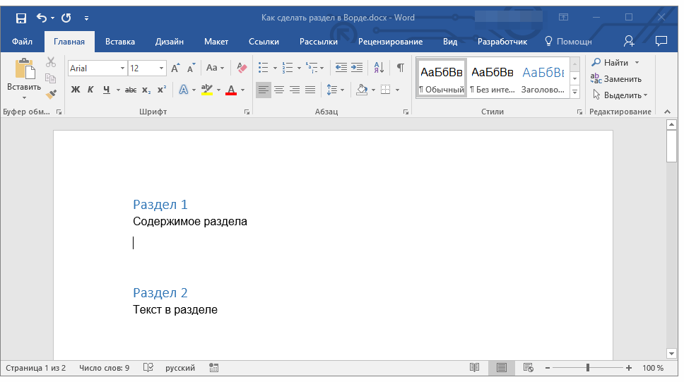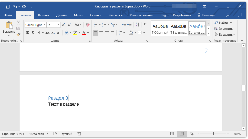 Чтобы начать новый раздел в документе, выполните следующие действия: