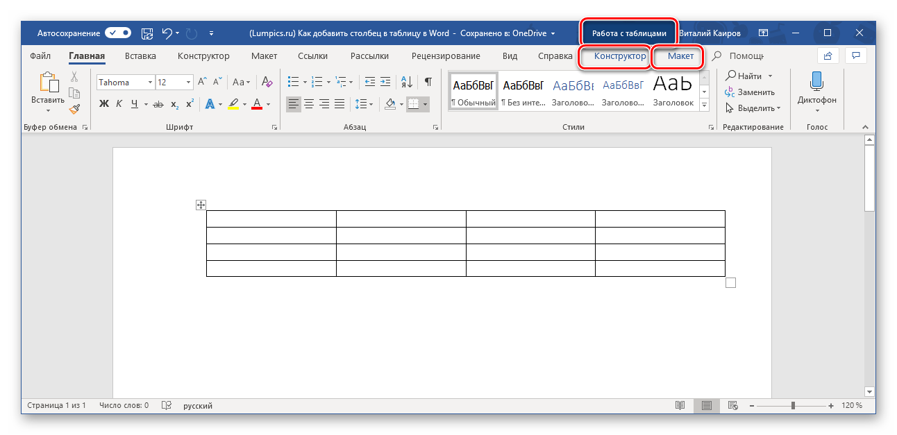 - Если вы только что создали таблицу, группа «Работа с таблицами», состоящая из вкладок «Конструктор» и «Макет», будет открыта автоматически. Если нет, самостоятельно перейдите во вторую.