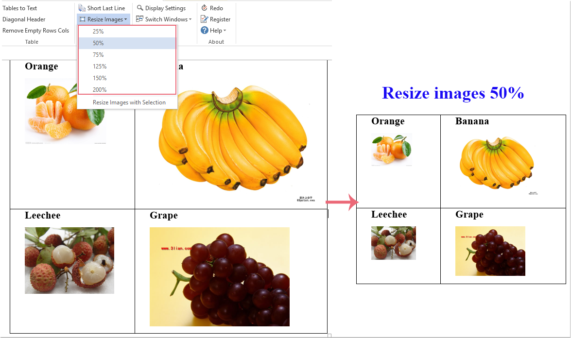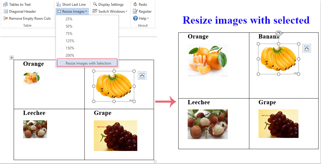 Для получения более подробной информации о Kutools for WordАвтора Изменение размера изображений утилита, нажмите здесь.