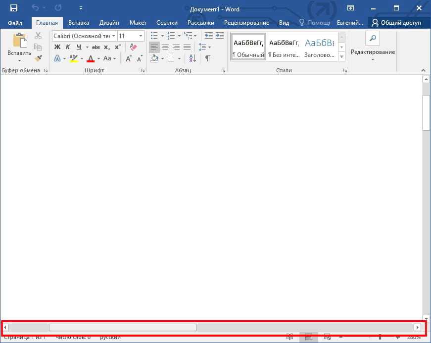Если Вы увеличите изображение до такой степени, что части документа Word больше не будут видны горизонтально, то в нижней части страницы появится горизонтальная полоса прокрутки.